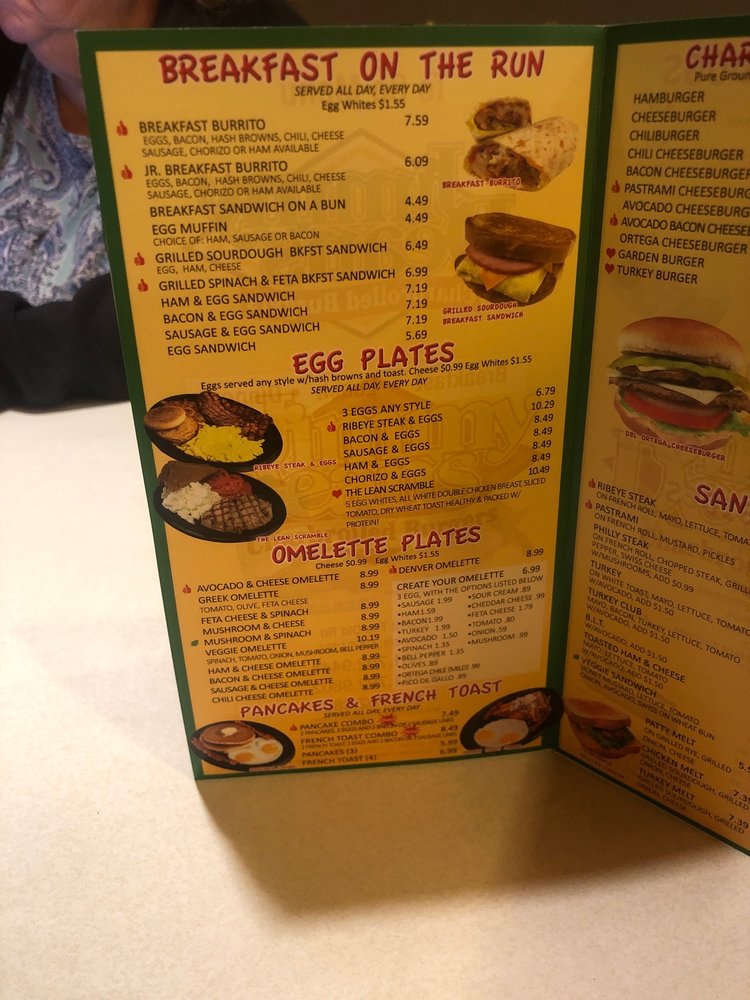 Eggs, bacon, hash browns, chili, cheese sausage, chorizo or ham available